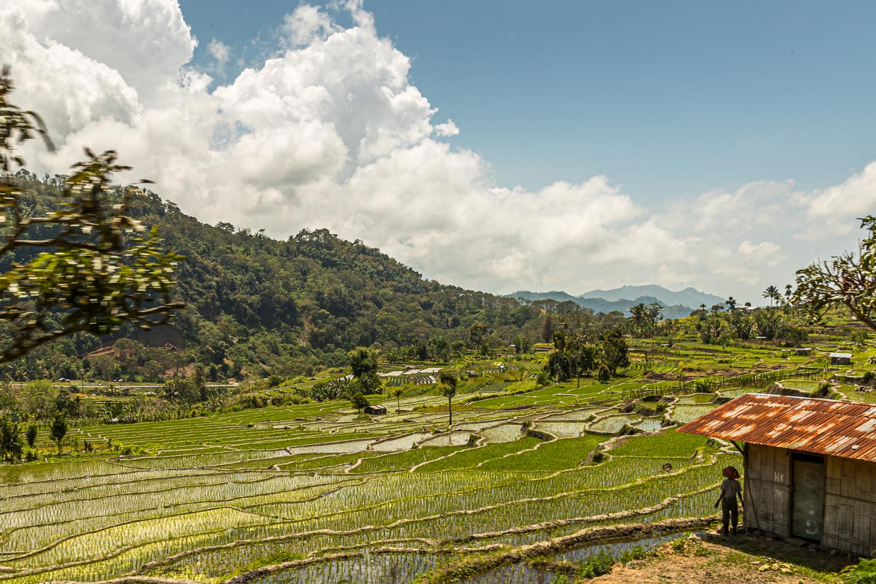 Ein Bauer steht an einer Blechhütte in den Reisfeldern auf der indonesischen Insel Flores / © Foto: Georg Berg