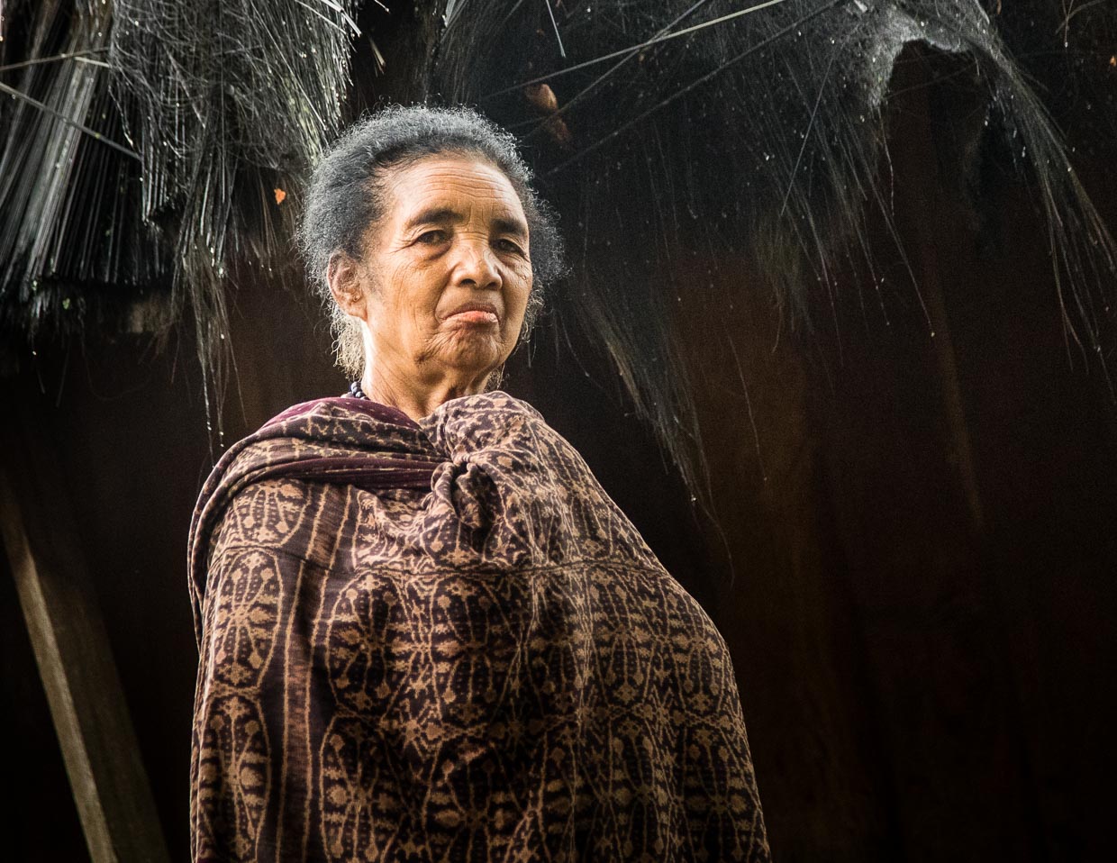 Frau in traditioneller Kleidung vor einer Hütte in Wologai, Indonesien / © Foto: Georg Berg