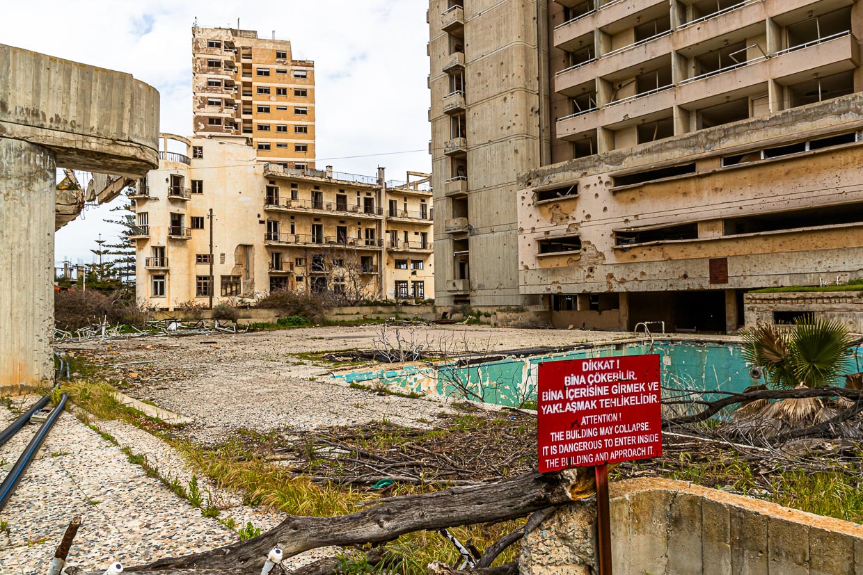 Einschusslöcher im Beton und leere Swimmingpools im ehemaligen Urlaubsparadies Varoscha / © Foto: Georg Berg