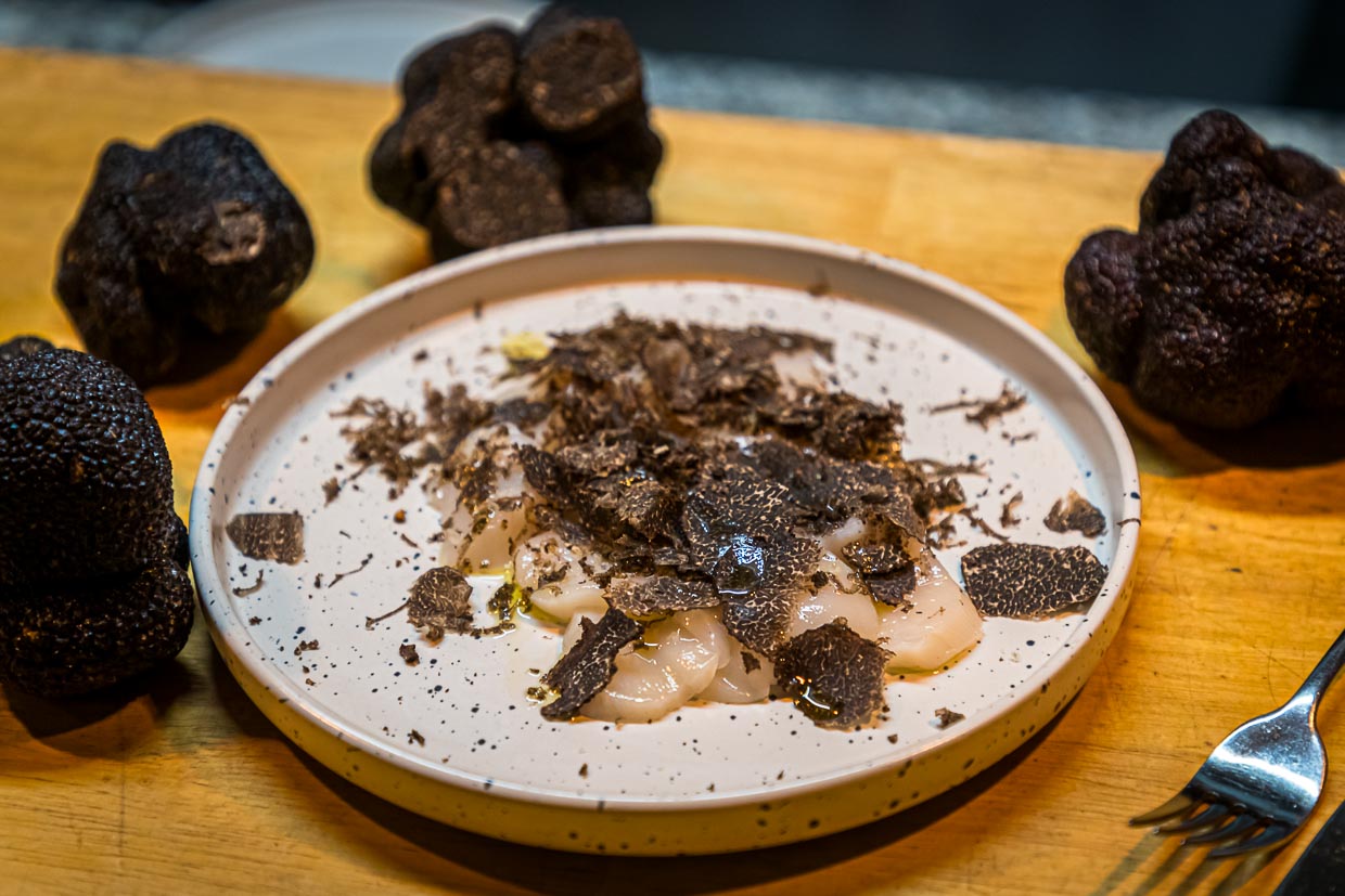 Frische Jakobsmuscheln gewürzt mit Meersalz, schwarzem Pfeffer und Olivenöl sowie frisch gehobeltem schwarzen Trüffel.  Reduziert auf diese wenigen Zutaten kommt das Aroma des schwarzen Trüffels sehr gut zur Geltung / © Foto: Georg Berg