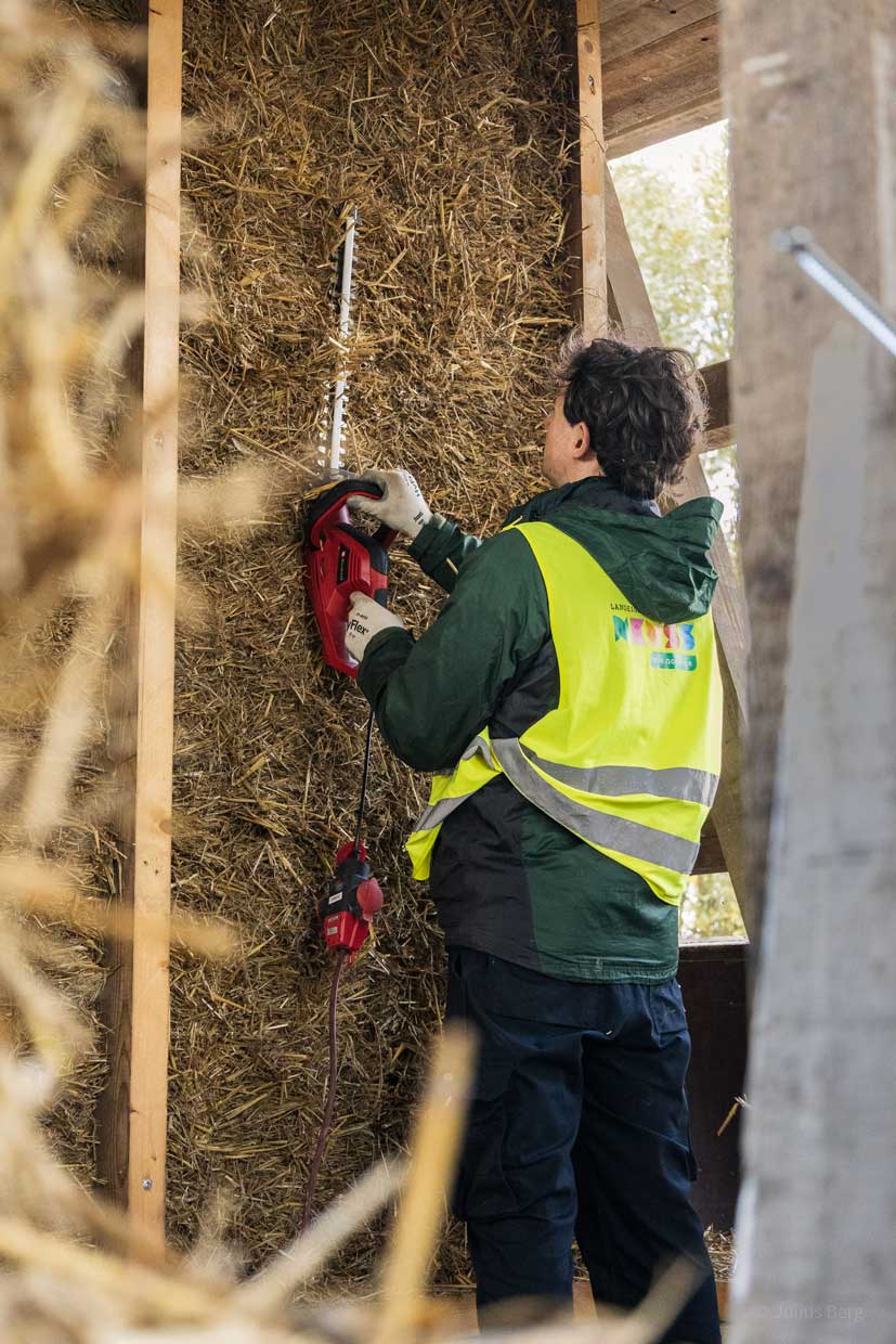 „Für die Workshops im August und Oktober 2025 warben wir über Social Media um Teilnehmende: Ein Drittel waren Studierende, zwei Drittel Berufseinsteiger – darunter ein gelernter Lehmbauer und ein Industriekletterer“, berichtet Franziska Müller. Für den Bau des Skaterpavillons gab es zwei Workshops: einen für die Konstruktion, einen für den Einsatz von Stroh und Lehm. Müller betont, dass das „Selber bauen und mitmachen“ perfekt zum ökologischen Bauen passe. Es zeige, dass nachhaltige Architektur ein kollektiver Prozess sei, der auch Ungeplantes einbeziehe. Als Beispiel nennt sie alte Boxentüren aus Pferdeställen, die nach dem Umarbeiten plötzlich zwei Zentimeter zu breit waren. Solche Situationen erforderten Improvisation und schärften den Blick für den Umgang mit vorhandener Substanz.