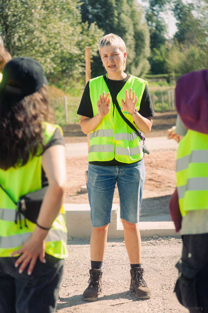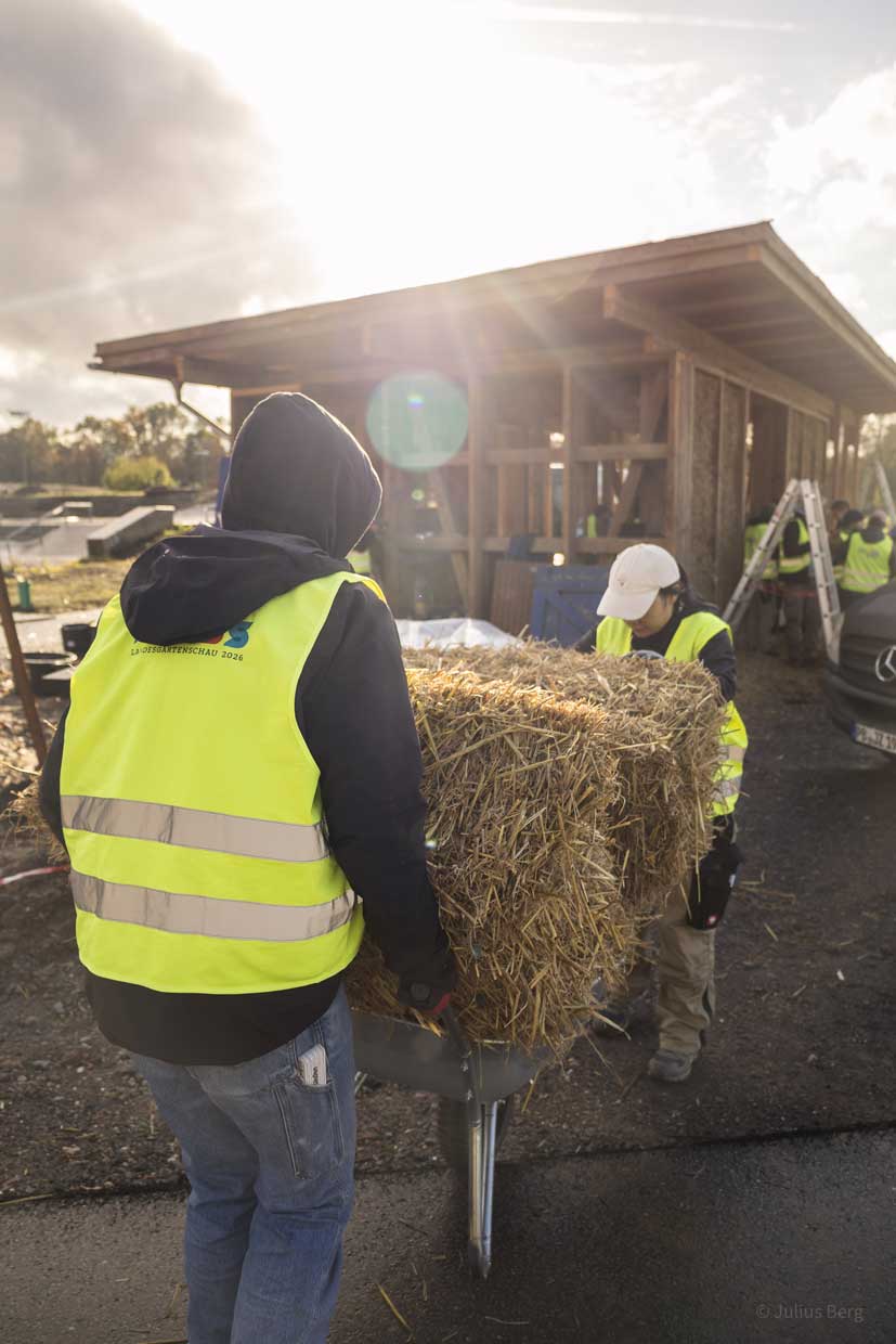 „Für die Workshops im August und Oktober 2025 warben wir über Social Media um Teilnehmende: Ein Drittel waren Studierende, zwei Drittel Berufseinsteiger – darunter ein gelernter Lehmbauer und ein Industriekletterer“, berichtet Franziska Müller. Für den Bau des Skaterpavillons gab es zwei Workshops: einen für die Konstruktion, einen für den Einsatz von Stroh und Lehm. Müller betont, dass das „Selber bauen und mitmachen“ perfekt zum ökologischen Bauen passe. Es zeige, dass nachhaltige Architektur ein kollektiver Prozess sei, der auch Ungeplantes einbeziehe. Als Beispiel nennt sie alte Boxentüren aus Pferdeställen, die nach dem Umarbeiten plötzlich zwei Zentimeter zu breit waren. Solche Situationen erforderten Improvisation und schärften den Blick für den Umgang mit vorhandener Substanz.