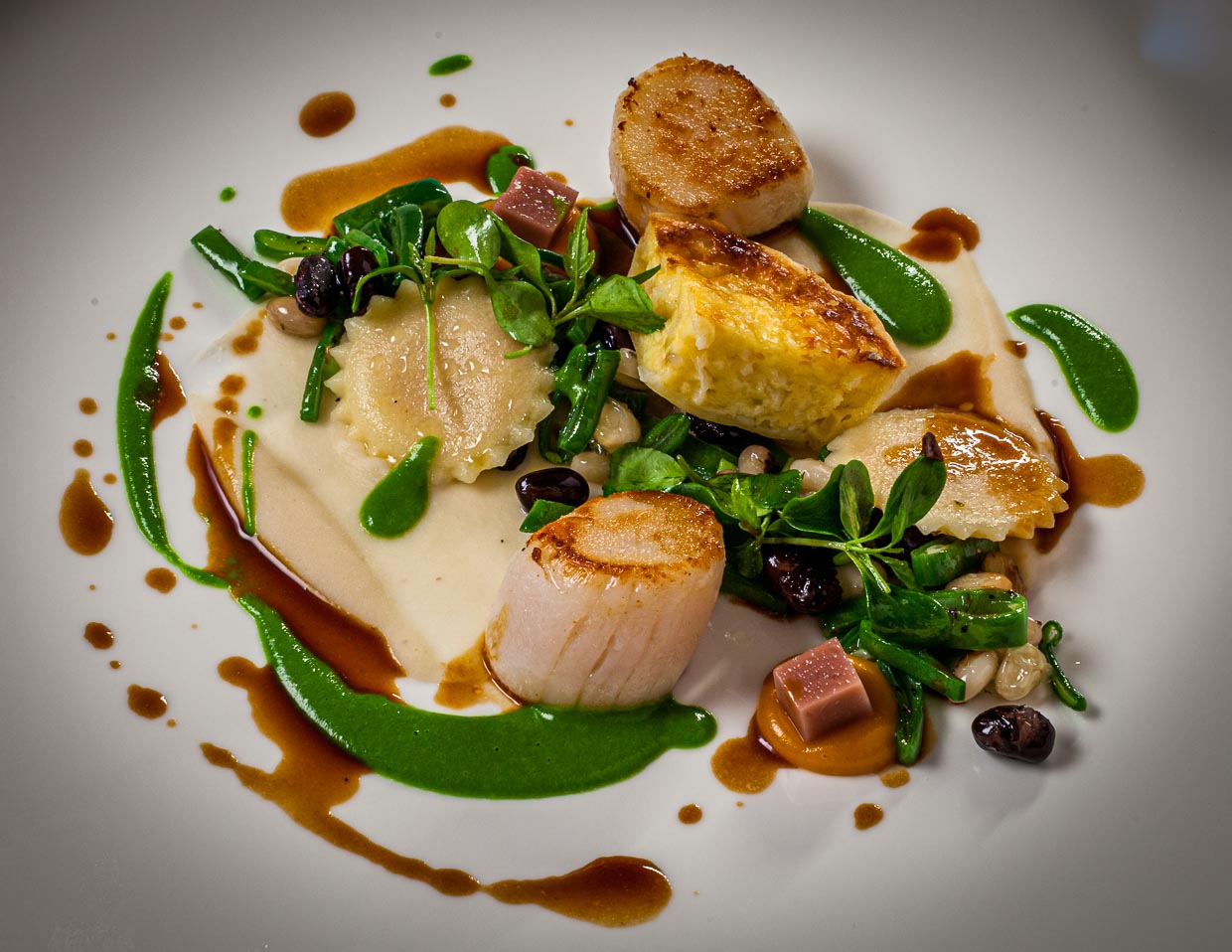 Oberstdorf Restaurant Maximilinas Michelin Star chef Tobias Eisele kombiniert Jakobsmuschel mit Bohne, Sanddorn und Zwiebel / © Foto: Georg Berg